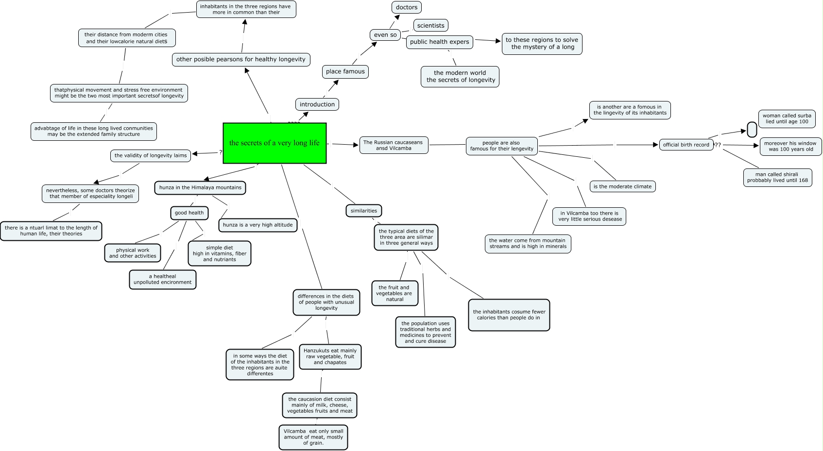 This Concept Map, created with IHMC CmapTools, has information related to: Writing Interrogatives, thatphysical movement and stress free environment might be the two most important secretsof longevity advabtage of life in these long lived conmunities may be the extended family structure, people are also famous for their lengevity official birth record, public health expers the modern world the secrets of longevity, the secrets of a very long life ???? the validity of longevity laims, hunza in the Himalaya mountains good health, people are also famous for their lengevity the water come from mountain streams and is high in minerals, differences in the diets of people with unusual longevity in some ways the diet of the inhabitants in the three regions are auite differentes, public health expers to these regions to solve the mystery of a long, the validity of longevity laims nevertheless, some doctors theorize that member of especiality longeli, similarities the typical diets of the three area are silimar in three general ways, even so scientists, The Russian caucaseans ansd Vilcamba people are also famous for their lengevity, the caucasion diet consist mainly of milk, cheese, vegetables fruits and meat Vilcamba eat only small amount of meat, mostly of grain., even so public health expers, the secrets of a very long life differences in the diets of people with unusual longevity, even so doctors, place famous even so, inhabitants in the three regions have more in common than their their distance from moderm cities and their lowcalorie natural diets, their distance from moderm cities and their lowcalorie natural diets thatphysical movement and stress free environment might be the two most important secretsof longevity, good health simple diet high in vitamins, fiber and nutriants