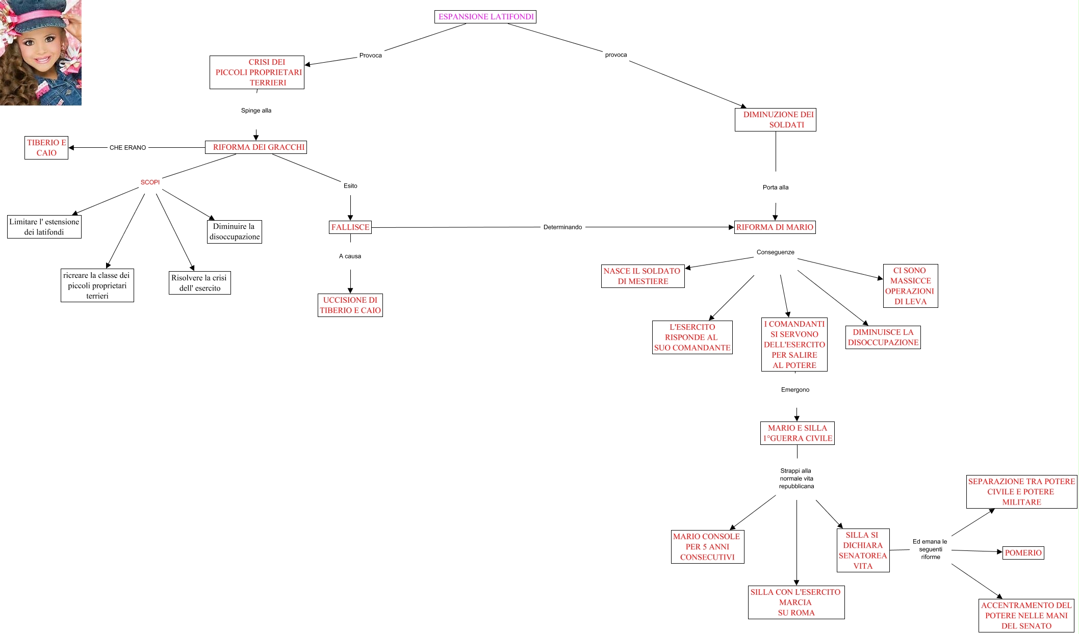 Questa Cmap, creata con IHMC CmapTools, contiene informazioni relative a: CrisiRomana_dalIIIsec_aC_Smerilli, MARIO E SILLA 1°GUERRA CIVILE Strappi alla normale vita repubblicana MARIO CONSOLE PER 5 ANNI CONSECUTIVI, MARIO E SILLA 1°GUERRA CIVILE Strappi alla normale vita repubblicana SILLA SI DICHIARA SENATOREA VITA, RIFORMA DEI GRACCHI SCOPI Limitare l' estensione dei latifondi, SILLA SI DICHIARA SENATOREA VITA Ed emana le seguenti riforme ACCENTRAMENTO DEL POTERE NELLE MANI DEL SENATO, ESPANSIONE LATIFONDI provoca DIMINUZIONE DEI SOLDATI, RIFORMA DI MARIO Conseguenze NASCE IL SOLDATO DI MESTIERE, RIFORMA DEI GRACCHI Esito FALLISCE, I COMANDANTI SI SERVONO DELL'ESERCITO PER SALIRE AL POTERE Emergono MARIO E SILLA 1°GUERRA CIVILE, ESPANSIONE LATIFONDI Provoca CRISI DEI PICCOLI PROPRIETARI TERRIERI, SILLA SI DICHIARA SENATOREA VITA Ed emana le seguenti riforme POMERIO, DIMINUZIONE DEI SOLDATI Porta alla RIFORMA DI MARIO, MARIO E SILLA 1°GUERRA CIVILE Strappi alla normale vita repubblicana SILLA CON L'ESERCITO MARCIA SU ROMA, FALLISCE A causa UCCISIONE DI TIBERIO E CAIO, RIFORMA DI MARIO Conseguenze CI SONO MASSICCE OPERAZIONI DI LEVA, SILLA SI DICHIARA SENATOREA VITA Ed emana le seguenti riforme SEPARAZIONE TRA POTERE CIVILE E POTERE MILITARE, CRISI DEI PICCOLI PROPRIETARI TERRIERI Spinge alla RIFORMA DEI GRACCHI, FALLISCE Determinando RIFORMA DI MARIO, RIFORMA DI MARIO Conseguenze DIMINUISCE LA DISOCCUPAZIONE, RIFORMA DEI GRACCHI SCOPI Risolvere la crisi dell' esercito, RIFORMA DI MARIO Conseguenze L'ESERCITO RISPONDE AL SUO COMANDANTE