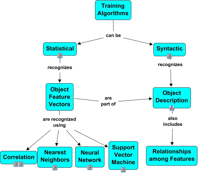 This Concept Map, created with IHMC CmapTools, has information related to: TrainingAlgorithms, Object Feature Vectors are part of Object Description, Object Feature Vectors are recognized using Neural Network, Object Feature Vectors are recognized using Support Vector Machine, Training Algorithms can be Statistical, Training Algorithms can be Syntactic, Object Feature Vectors are recognized using Nearest Neighbors, Syntactic recognizes Object Description, Statistical recognizes Object Feature Vectors, Object Description also includes Relationships among Features, Object Feature Vectors are recognized using Correlation