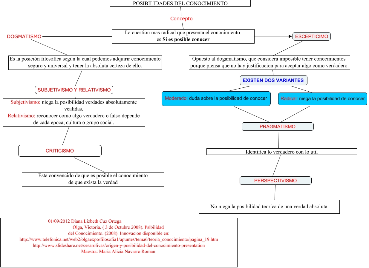 Este Cmap, tiene información relacionada con: concetto, La cuestion mas radical que presenta el conocimiento es Si es posible conocer ???? ESCEPTICIMO, La cuestion mas radical que presenta el conocimiento es Si es posible conocer DOGMATISMO Es la posición filosófica según la cual podemos adquirir conocimiento seguro y universal y tener la absoluta certeza de ello., ESCEPTICIMO ???? Opuesto al dogamatismo, que considera imposible tener conocimientos porque piensa que no hay justificacion para aceptar algo como verdadero., EXISTEN DOS VARIANTES ???? Opuesto al dogamatismo, que considera imposible tener conocimientos porque piensa que no hay justificacion para aceptar algo como verdadero., Subjetivismo: niega la posibilidad verdades absolutamente vcalidas. Relativismo: reconocer como algo verdadero o falso depende de cada epoca, cultura o grupo social. ???? CRITICISMO, EXISTEN DOS VARIANTES ???? Moderado: duda sobre la posibilidad de conocer, POSIBILIDADES DEL CONOCIMIENTO Concepto La cuestion mas radical que presenta el conocimiento es Si es posible conocer, SUBJETIVISMO Y RELATIVISMO ???? Subjetivismo: niega la posibilidad verdades absolutamente vcalidas. Relativismo: reconocer como algo verdadero o falso depende de cada epoca, cultura o grupo social., PERSPECTIVISMO ???? No niega la posibilidad teorica de una verdad absoluta, Moderado: duda sobre la posibilidad de conocer ???? PRAGMATISMO, PRAGMATISMO ???? Identifica lo verdadero con lo util, Es la posición filosófica según la cual podemos adquirir conocimiento seguro y universal y tener la absoluta certeza de ello. ???? SUBJETIVISMO Y RELATIVISMO, Identifica lo verdadero con lo util ???? PERSPECTIVISMO, Radical: niega la posibilidad de conocer ???? PRAGMATISMO, CRITICISMO ???? Esta convencido de que es posible el conocimiento de que exista la verdad, EXISTEN DOS VARIANTES ???? Radical: niega la posibilidad de conocer