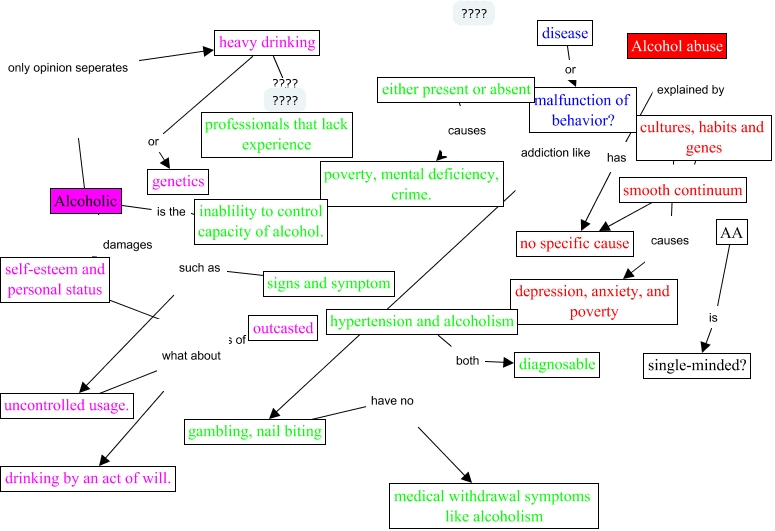 Este Cmap, tiene información relacionada con: alcoholism, gambling, nail biting have no medical withdrawal symptoms like alcoholism, Alcohol abuse explained by cultures, habits and genes, heavy drinking or genetics, uncontrolled usage. what about drinking by an act of will., heavy drinking ???? ????, hypertension and alcoholism both diagnosable, self-esteem and personal status feelings of outcasted, Alcoholic damages self-esteem and personal status, Alcoholic is the inablility to control capacity of alcohol., cultures, habits and genes ???? no specific cause, Alcohol abuse has no specific cause, Alcohol abuse causes depression, anxiety, and poverty, AA is single-minded?, signs and symptom such as uncontrolled usage., malfunction of behavior? addiction like gambling, nail biting, either present or absent causes poverty, mental deficiency, crime., Alcoholic only opinion seperates heavy drinking, disease or malfunction of behavior?