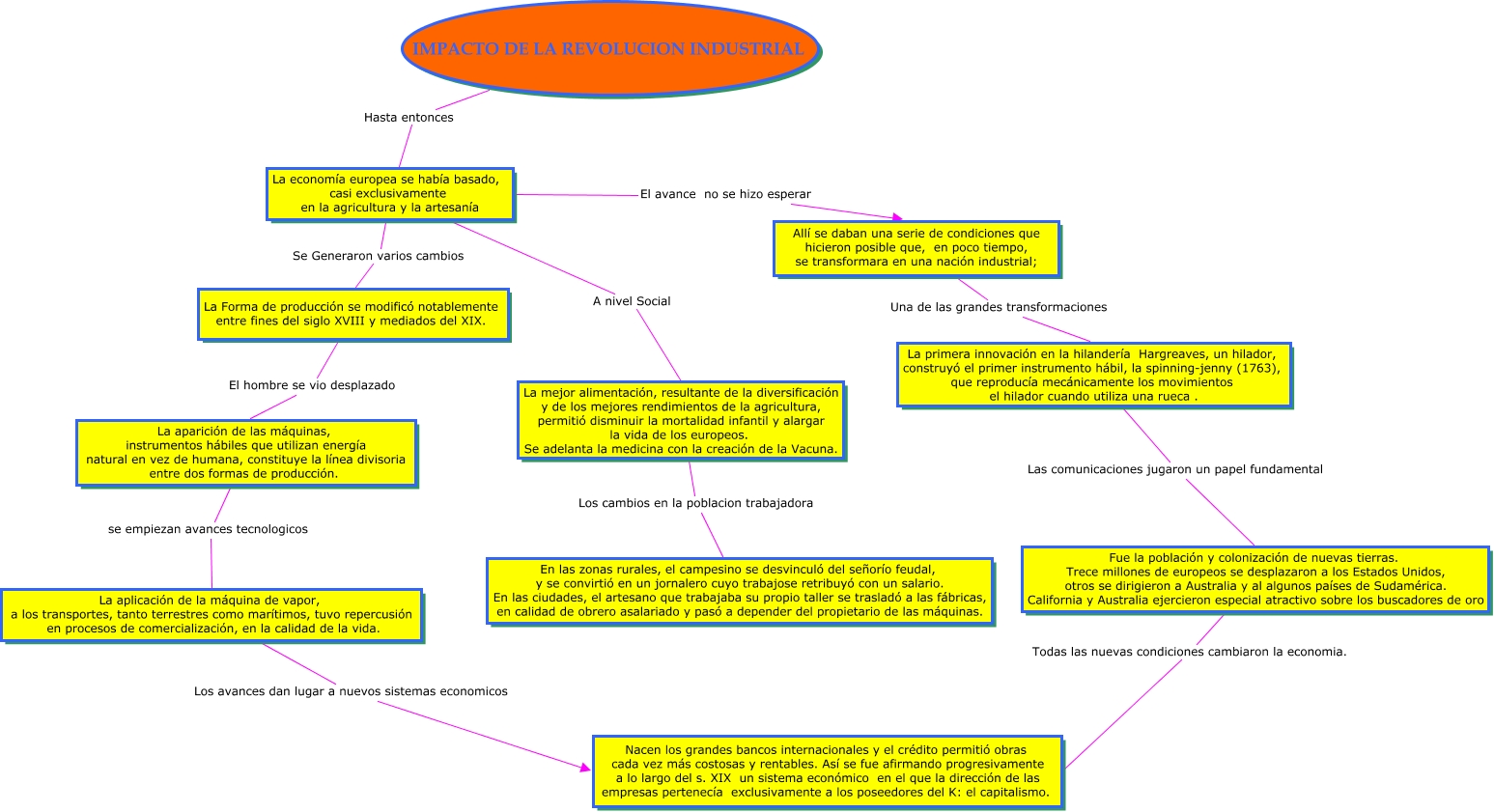 Este Cmap, tiene información relacionada con: revolucion industrial, La economía europea se había basado, casi exclusivamente en la agricultura y la artesanía A nivel Social La mejor alimentación, resultante de la diversificación y de los mejores rendimientos de la agricultura, permitió disminuir la mortalidad infantil y alargar la vida de los europeos. Se adelanta la medicina con la creación de la Vacuna., La mejor alimentación, resultante de la diversificación y de los mejores rendimientos de la agricultura, permitió disminuir la mortalidad infantil y alargar la vida de los europeos. Se adelanta la medicina con la creación de la Vacuna. Los cambios en la poblacion trabajadora En las zonas rurales, el campesino se desvinculó del señorío feudal, y se convirtió en un jornalero cuyo trabajose retribuyó con un salario. En las ciudades, el artesano que trabajaba su propio taller se trasladó a las fábricas, en calidad de obrero asalariado y pasó a depender del propietario de las máquinas., Allí se daban una serie de condiciones que hicieron posible que, en poco tiempo, se transformara en una nación industrial; Una de las grandes transformaciones La primera innovación en la hilandería Hargreaves, un hilador, construyó el primer instrumento hábil, la spinning-jenny (1763), que reproducía mecánicamente los movimientos el hilador cuando utiliza una rueca ., IMPACTO DE LA REVOLUCION INDUSTRIAL Hasta entonces La economía europea se había basado, casi exclusivamente en la agricultura y la artesanía, La aplicación de la máquina de vapor, a los transportes, tanto terrestres como marítimos, tuvo repercusión en procesos de comercialización, en la calidad de la vida. Los avances dan lugar a nuevos sistemas economicos Nacen los grandes bancos internacionales y el crédito permitió obras cada vez más costosas y rentables. Así se fue afirmando progresivamente a lo largo del s. XIX un sistema económico en el que la dirección de las empresas pertenecía exclusivamente a los poseedores del K: el capitalismo., Fue la población y colonización de nuevas tierras. Trece millones de europeos se desplazaron a los Estados Unidos, otros se dirigieron a Australia y al algunos países de Sudamérica. California y Australia ejercieron especial atractivo sobre los buscadores de oro Todas las nuevas condiciones cambiaron la economia. Nacen los grandes bancos internacionales y el crédito permitió obras cada vez más costosas y rentables. Así se fue afirmando progresivamente a lo largo del s. XIX un sistema económico en el que la dirección de las empresas pertenecía exclusivamente a los poseedores del K: el capitalismo., La Forma de producción se modificó notablemente entre fines del siglo XVIII y mediados del XIX. El hombre se vio desplazado La aparición de las máquinas, instrumentos hábiles que utilizan energía natural en vez de humana, constituye la línea divisoria entre dos formas de producción., La primera innovación en la hilandería Hargreaves, un hilador, construyó el primer instrumento hábil, la spinning-jenny (1763), que reproducía mecánicamente los movimientos el hilador cuando utiliza una rueca . Las comunicaciones jugaron un papel fundamental Fue la población y colonización de nuevas tierras. Trece millones de europeos se desplazaron a los Estados Unidos, otros se dirigieron a Australia y al algunos países de Sudamérica. California y Australia ejercieron especial atractivo sobre los buscadores de oro, La economía europea se había basado, casi exclusivamente en la agricultura y la artesanía El avance no se hizo esperar Allí se daban una serie de condiciones que hicieron posible que, en poco tiempo, se transformara en una nación industrial;, La economía europea se había basado, casi exclusivamente en la agricultura y la artesanía Se Generaron varios cambios La Forma de producción se modificó notablemente entre fines del siglo XVIII y mediados del XIX., La aparición de las máquinas, instrumentos hábiles que utilizan energía natural en vez de humana, constituye la línea divisoria entre dos formas de producción. se empiezan avances tecnologicos La aplicación de la máquina de vapor, a los transportes, tanto terrestres como marítimos, tuvo repercusión en procesos de comercialización, en la calidad de la vida.