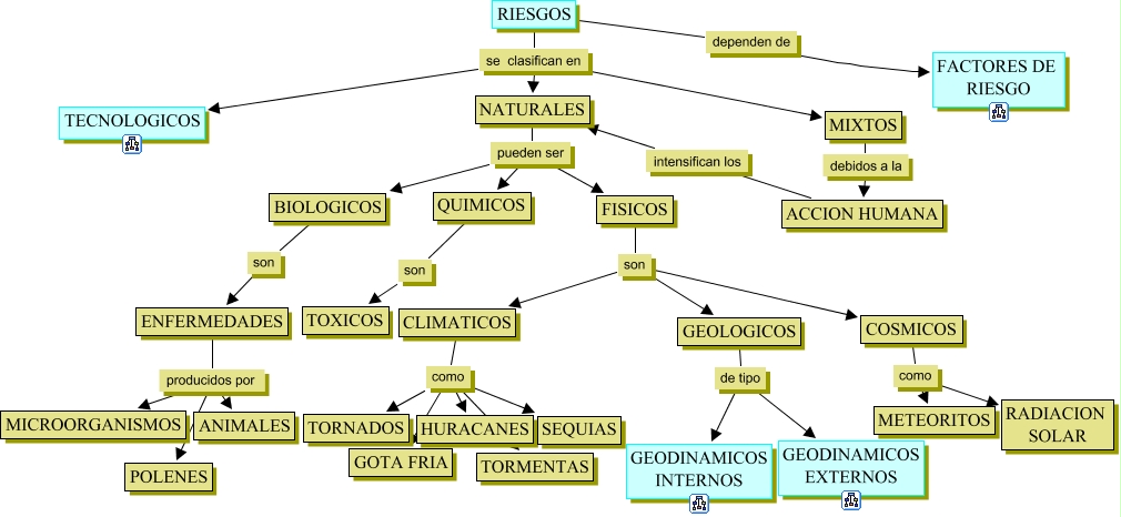 Este Cmap, tiene información relacionada con: RIESGOS (2), NATURALES pueden ser FISICOS, RIESGOS se clasifican en NATURALES, CLIMATICOS como HURACANES, ENFERMEDADES producidos por POLENES, FISICOS son CLIMATICOS, NATURALES pueden ser BIOLOGICOS, CLIMATICOS como TORNADOS, COSMICOS como METEORITOS, FISICOS son GEOLOGICOS, FISICOS son COSMICOS, BIOLOGICOS son ENFERMEDADES, RIESGOS dependen de FACTORES DE RIESGO, CLIMATICOS como TORMENTAS, GEOLOGICOS de tipo GEODINAMICOS INTERNOS, GEOLOGICOS de tipo GEODINAMICOS EXTERNOS, CLIMATICOS como SEQUIAS, ENFERMEDADES producidos por ANIMALES, QUIMICOS son TOXICOS, CLIMATICOS como GOTA FRIA, RIESGOS se clasifican en TECNOLOGICOS