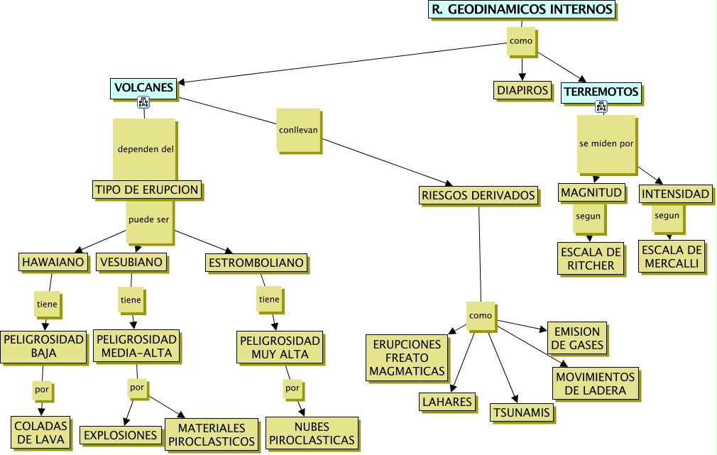 Este Cmap, tiene información relacionada con: RIESGOS GEOLOGICOS(2), PELIGROSIDAD MUY ALTA por NUBES PIROCLASTICAS, TERREMOTOS se miden por MAGNITUD, PELIGROSIDAD BAJA por COLADAS DE LAVA, RIESGOS DERIVADOS como TSUNAMIS, PELIGROSIDAD MEDIA-ALTA por EXPLOSIONES, TIPO DE ERUPCION puede ser HAWAIANO, MAGNITUD segun ESCALA DE RITCHER, TERREMOTOS se miden por INTENSIDAD, ESTROMBOLIANO tiene PELIGROSIDAD MUY ALTA, RIESGOS DERIVADOS como ERUPCIONES FREATO MAGMATICAS, RIESGOS DERIVADOS como LAHARES, VOLCANES dependen del TIPO DE ERUPCION, R. GEODINAMICOS INTERNOS como TERREMOTOS, R. GEODINAMICOS INTERNOS como VOLCANES, R. GEODINAMICOS INTERNOS como DIAPIROS, RIESGOS DERIVADOS como MOVIMIENTOS DE LADERA, VESUBIANO tiene PELIGROSIDAD MEDIA-ALTA, VOLCANES conllevan RIESGOS DERIVADOS, RIESGOS DERIVADOS como EMISION DE GASES, PELIGROSIDAD MEDIA-ALTA por MATERIALES PIROCLASTICOS