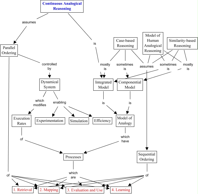 Cette carte de concepts créée avec IHMC CmapTools traite de: Continuous Analogical Reasoning, Parallel Ordering of 1. Retrieval, Dynamical System enabling Experimentation, Case-based Reasoning mostly is Integrated Model, Integrated Model is Model of Analogy, Similarity-based Reasoning mostly is Componential Model, Continuous Analogical Reasoning assumes Parallel Ordering, Case-based Reasoning assumes Sequential Ordering, Sequential Ordering of 3. Evaluation and Use, Sequential Ordering of 1. Retrieval, Model of Human Analogical Reasoning assumes Sequential Ordering, Parallel Ordering of 4. Learning, Sequential Ordering of 2. Mapping, Componential Model is Model of Analogy, Parallel Ordering controlled by Dynamical System, Dynamical System which modifies Execution Rates, Similarity-based Reasoning assumes Sequential Ordering, Dynamical System enabling Efficiency, Processes which are 1. Retrieval, Sequential Ordering of 4. Learning, Processes which are 3. Evaluation and Use