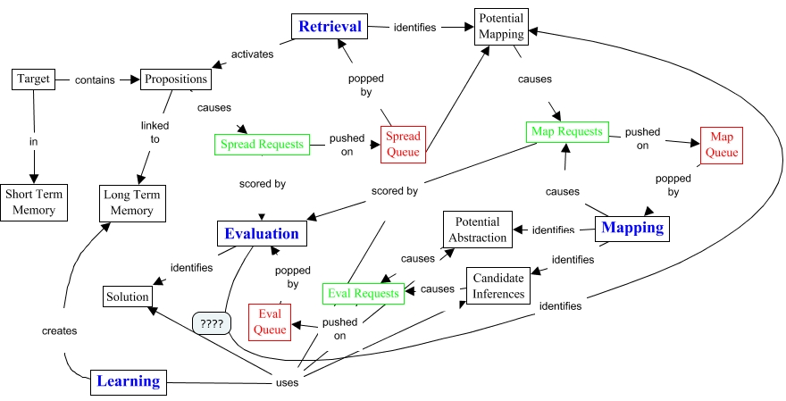 This Concept Map, created with IHMC CmapTools, has information related to: CAR Architecture Data Flow, Candidate Inferences causes Eval Requests, Propositions causes Spread Requests, Learning uses Solution, Learning creates Long Term Memory, Learning uses Candidate Inferences, Learning uses Potential Abstraction, Mapping identifies Candidate Inferences, Potential Abstraction causes Eval Requests, Target contains Propositions, Spread Requests scored by Evaluation, Spread Requests pushed on Spread Queue, Potential Mapping causes Map Requests, Spread Queue popped by Retrieval, Target in Short Term Memory, Eval Queue popped by Evaluation, Learning uses Potential Mapping, Map Requests pushed on Map Queue, Retrieval activates Propositions, Eval Requests pushed on Eval Queue, Evaluation identifies Solution