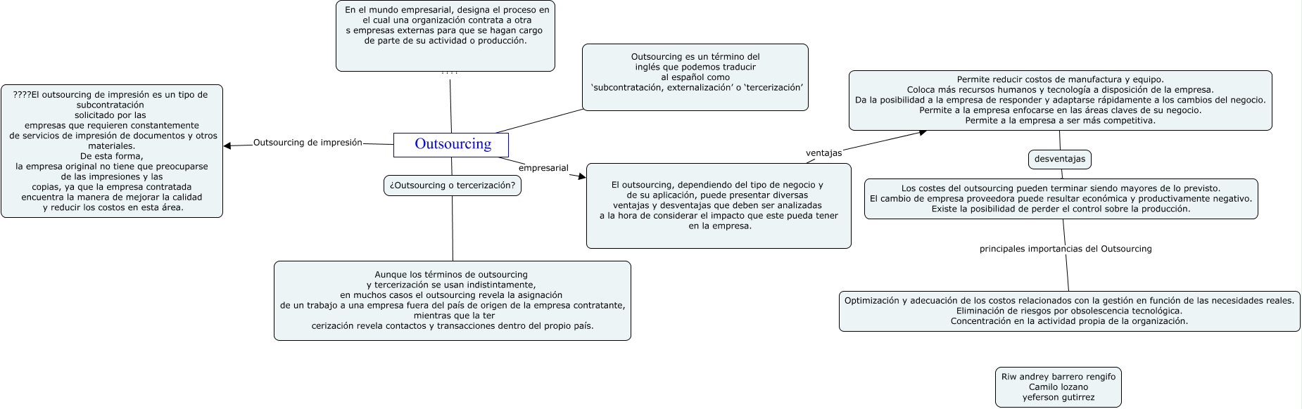 Este Cmap, tiene información relacionada con: Wilton Manor, Los costes del outsourcing pueden terminar siendo mayores de lo previsto. El cambio de empresa proveedora puede resultar económica y productivamente negativo. Existe la posibilidad de perder el control sobre la producción. principales importancias del Outsourcing Optimización y adecuación de los costos relacionados con la gestión en función de las necesidades reales. Eliminación de riesgos por obsolescencia tecnológica. Concentración en la actividad propia de la organización., desventajas . Los costes del outsourcing pueden terminar siendo mayores de lo previsto. El cambio de empresa proveedora puede resultar económica y productivamente negativo. Existe la posibilidad de perder el control sobre la producción., Permite reducir costos de manufactura y equipo. Coloca más recursos humanos y tecnología a disposición de la empresa. Da la posibilidad a la empresa de responder y adaptarse rápidamente a los cambios del negocio. Permite a la empresa enfocarse en las áreas claves de su negocio. Permite a la empresa a ser más competitiva. ???? desventajas, Outsourcing . Aunque los términos de outsourcing y tercerización se usan indistintamente, en muchos casos el outsourcing revela la asignación de un trabajo a una empresa fuera del país de origen de la empresa contratante, mientras que la ter cerización revela contactos y transacciones dentro del propio país., Outsourcing empresarial El outsourcing, dependiendo del tipo de negocio y de su aplicación, puede presentar diversas ventajas y desventajas que deben ser analizadas a la hora de considerar el impacto que este pueda tener en la empresa., Outsourcing ???? Outsourcing es un término del inglés que podemos traducir al español como ‘subcontratación, externalización’ o ‘tercerización’, El outsourcing, dependiendo del tipo de negocio y de su aplicación, puede presentar diversas ventajas y desventajas que deben ser analizadas a la hora de considerar el impacto que este pueda tener en la empresa. ventajas Permite reducir costos de manufactura y equipo. Coloca más recursos humanos y tecnología a disposición de la empresa. Da la posibilidad a la empresa de responder y adaptarse rápidamente a los cambios del negocio. Permite a la empresa enfocarse en las áreas claves de su negocio. Permite a la empresa a ser más competitiva., Outsourcing Outsourcing de impresión ????El outsourcing de impresión es un tipo de subcontratación solicitado por las empresas que requieren constantemente de servicios de impresión de documentos y otros materiales. De esta forma, la empresa original no tiene que preocuparse de las impresiones y las copias, ya que la empresa contratada encuentra la manera de mejorar la calidad y reducir los costos en esta área., En el mundo empresarial, designa el proceso en el cual una organización contrata a otra s empresas externas para que se hagan cargo de parte de su actividad o producción. ???? Outsourcing