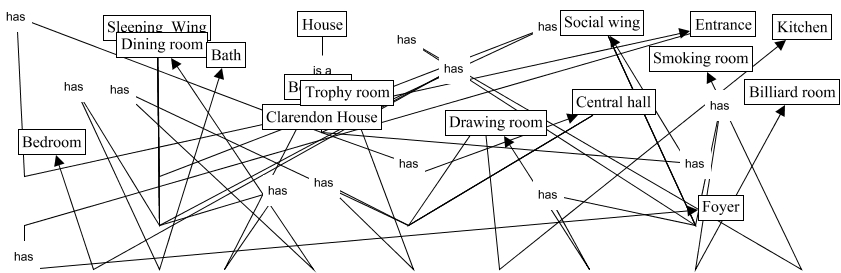 This Concept Map, created with IHMC CmapTools, has information related to: Clarendon House, Sleeping Wing has Bedroom, Central hall has Trophy room, Sleeping Wing has Bedroom, Clarendon House has Sleeping Wing, Entrance has Foyer, Clarendon House has Entrance, Clarendon House has Central hall, Social wing has Billiard room, Central hall has Dining room, Social wing has Smoking room, Social wing has Drawing room, Central hall has Kitchen, Sleeping Wing has Bath, Clarendon House has Social wing, House is a Clarendon House
