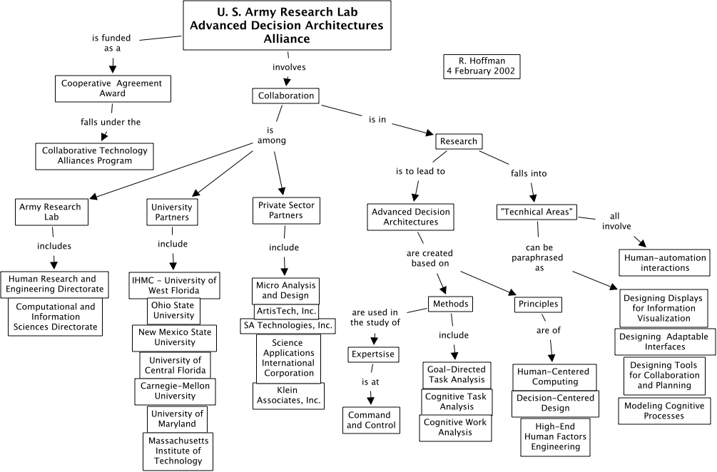 Simple_ARLADA_Map, Expertsise is at Command and Control, Methods include Goal-Directed Task Analysis, U. S. Army Research Lab Advanced Decision Architectures Alliance is funded as a Cooperative Agreement Award, Private Sector Partners include Micro Analysis and Design, University Partners include IHMC - University of West Florida, "Tecnhical Areas" all involve Human-automation interactions, Collaboration is in Research, Research is to lead to Advanced Decision Architectures, Principles are of Human-Centered Computing, Army Research Lab includes Human Research and Engineering Directorate