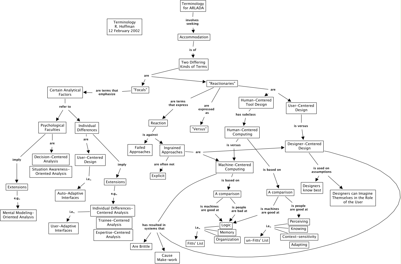 Terminology for ARLADA, Human-Centered Tool Design has subclass Human-Centered Computing, Knowing i.e., un-Fitts' List, A comparison is machines are good at Logic, Two Differing Kinds of Terms are "Reactionaries", Psychological Faculties are Decision-Centered Analysis, Ingrained Approaches are Machine-Centered Computing, Accommodation is of Two Differing Kinds of Terms, Two Differing Kinds of Terms are "Focals", Human-Centered Computing is based on A comparison, "Focals" are terms that emphasize Certain Analytical Factors