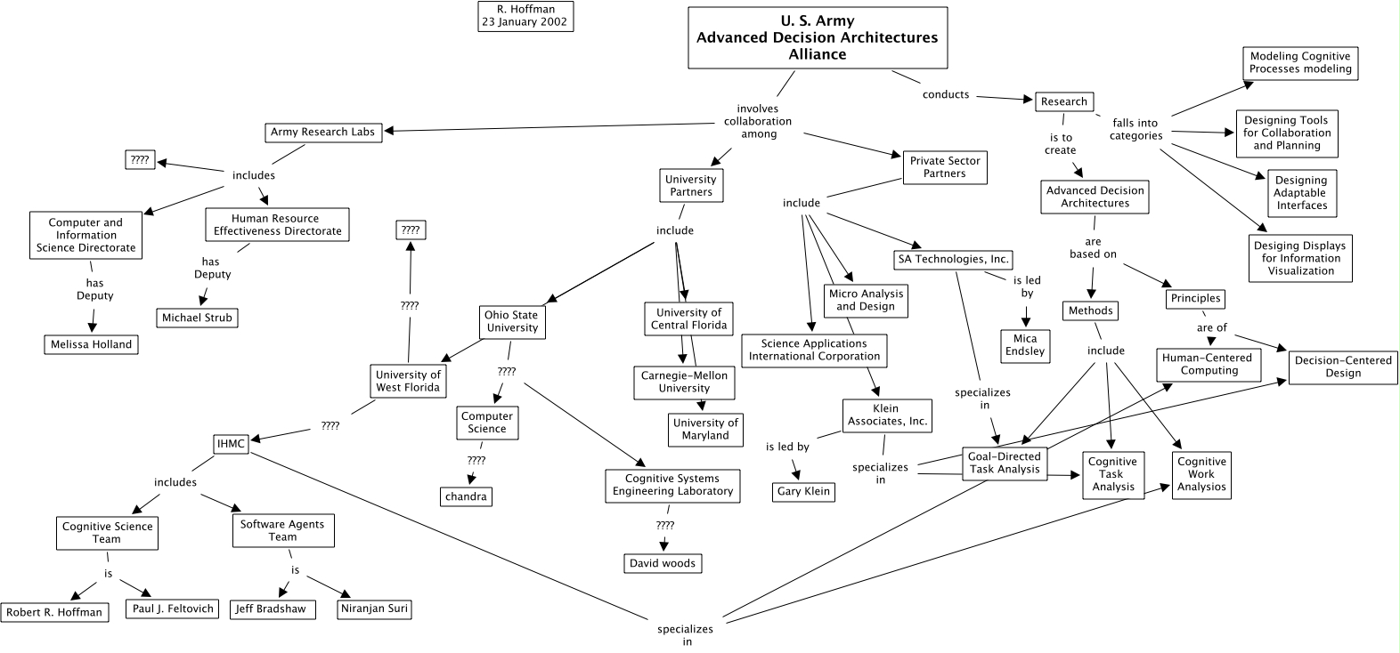 ARLADA Top Map, University of West Florida ???? ????, Research falls into categories Modeling Cognitive Processes modeling, University Partners include University of West Florida, University Partners include Carnegie-Mellon University, IHMC specializes in Cognitive Work Analysios, Army Research Labs includes Human Resource Effectiveness Directorate, University Partners include Ohio State University, IHMC includes Cognitive Science Team, SA Technologies, Inc. specializes in Goal-Directed Task Analysis, University Partners include University of Central Florida