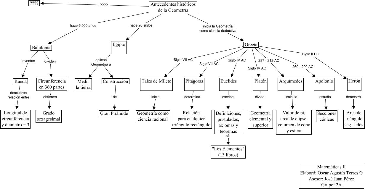 Este Cmap, tiene información relacionada con: Antecedentes Historicos Geometria, Babilonia dividen Circunferencia en 360 partes, Egipto aplican Geometría a Medir la tierra, Definiciones, postulados, axiomas y teoremas en "Los Elementos" (13 libros), Antecedentes históricos de la Geometría ???? ????, Rueda descubren relación entre Longitud de circunferencia y diámetro = 3, Grecia Siglo VII AC Tales de Mileto, Grecia Siglo IV AC Platón, Apolonio estudia Secciones cónicas, Antecedentes históricos de la Geometría hace 20 siglos Egipto, Euclides escribe Definiciones, postulados, axiomas y teoremas, Egipto aplican Geometría a Construcción, Circunferencia en 360 partes obtienen Grado sexagesimal, Construcción de Gran Pirámide, Grecia Siglo II DC Herón, Arquímedes calcula Valor de pi, area de elipse, volumen de cono y esfera, Grecia Siglo VII AC Pitágoras, Grecia 260 - 200 AC Apolonio, Platón divide Geometría elemental y superior, Herón demostró Area de triángulo seg. lados, Tales de Mileto inicia Geometría como ciencia racional