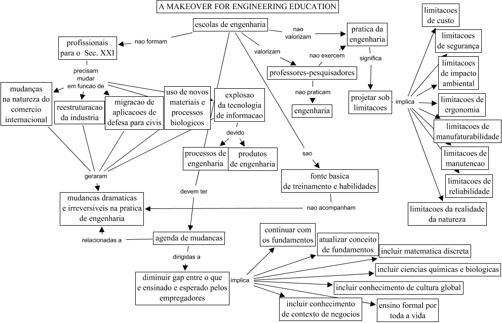 This Concept Map, created with IHMC CmapTools, has information related to: wulf-fisher map, escolas de engenharia devem ter agenda de mudancas, diminuir gap entre o que e ensinado e esperado pelos empregadores implica atualizar conceito de fundamentos, professores-pesquisadores nao exercem pratica da engenharia, mudanças na natureza do comercio internacional geraram mudancas dramaticas e irreversiveis na pratica de engenharia, escolas de engenharia valorizam professores-pesquisadores, pratica da engenharia significa projetar sob limitacoes, migracao de aplicacoes de defesa para civis geraram mudancas dramaticas e irreversiveis na pratica de engenharia, projetar sob limitacoes implica limitacoes de custo, diminuir gap entre o que e ensinado e esperado pelos empregadores implica continuar com os fundamentos, projetar sob limitacoes implica limitacoes da realidade da natureza, escolas de engenharia nao valorizam pratica da engenharia, diminuir gap entre o que e ensinado e esperado pelos empregadores implica incluir conhecimento de contexto de negocios, profissionais para o Sec. XXI precisam mudar em funcao de explosao da tecnologia de informacao, explosao da tecnologia de informacao devido produtos de engenharia, uso de novos materiais e processos biologicos geraram mudancas dramaticas e irreversiveis na pratica de engenharia, diminuir gap entre o que e ensinado e esperado pelos empregadores implica incluir conhecimento de cultura global, professores-pesquisadores nao praticam engenharia, reestruturacao da industria geraram mudancas dramaticas e irreversiveis na pratica de engenharia, projetar sob limitacoes implica limitacoes de manutencao, escolas de engenharia sao fonte basica de treinamento e habilidades