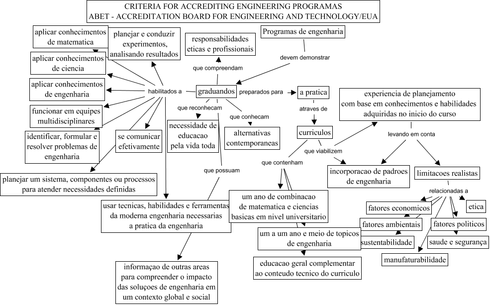 This Concept Map, created with IHMC CmapTools, has information related to: criterios acreditacao, curriculos que contenham um ano de combinacao de matematica e ciencias basicas em nivel universitario, experiencia de planejamento com base em conhecimentos e habilidades adquiridas no inicio do curso levando em conta incorporacao de padroes de engenharia, limitacoes realistas relacionadas a sustentabilidade, curriculos que contenham educacao geral complementar ao conteudo tecnico do curriculo, curriculos que viabilizem experiencia de planejamento com base em conhecimentos e habilidades adquiridas no inicio do curso, graduandos habilitados a identificar, formular e resolver problemas de engenharia, graduandos habilitados a funcionar em equipes multidisciplinares, limitacoes realistas relacionadas a saude e segurança, graduandos preparados para a pratica, curriculos que contenham um a um ano e meio de topicos de engenharia, limitacoes realistas relacionadas a fatores politicos, graduandos habilitados a se comunicar efetivamente, a pratica atraves de curriculos, graduandos habilitados a planejar e conduzir experimentos, analisando resultados, limitacoes realistas relacionadas a manufaturabilidade, graduandos habilitados a aplicar conhecimentos de ciencia, graduandos que conhecam alternativas contemporaneas, curriculos que viabilizem incorporacao de padroes de engenharia, graduandos que reconhecam necessidade de educacao pela vida toda, graduandos habilitados a usar tecnicas, habilidades e ferramentas da moderna engenharia necessarias a pratica da engenharia
