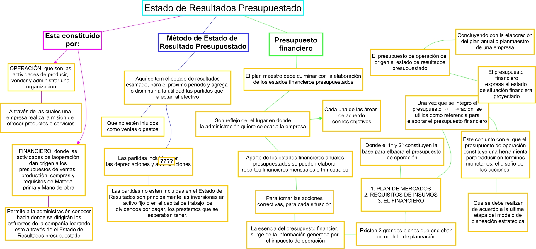Este Cmap, tiene información relacionada con: CALIDADOK, Método de Estado de Resultado Presupuestado ???? Aquí se tom el estado de resultados estimado, para el proximo periodo y agrega o disminuir a la utilidad las partidas que afectan al efectivo, OPERACIÓN: que son las actividades de producir, vender y administrar una organización ???? A través de las cuales una empresa realiza la misión de ofrecer productos o servicios, Este conjunto con el que el presupuesto de operación constituye una herramienta para traducir en terminos monetarios, el diseño de las acciones. ???? Que se debe realizar de acuerdo a la última etapa del modelo de planeación estratégica, Aparte de los estados financieros anuales presupuestados se pueden elaborar reportes financieros mensuales o trimestrales ???? Para tomar las acciones correctivas, para cada situación, FINANCIERO: donde las actividades de laoperación dan origen a los presupuestos de ventas, producción, compras y requisitos de Materia prima y Mano de obra ???? Permite a la administración conocer hacia donde se dirigirán los esfuerzos de la compañía logrando esto a través de el Estado de Resultados presupuestado, 1. PLAN DE MERCADOS 2. REQUISITOS DE INSUMOS 3. EL FINANCIERO ???? Donde el 1° y 2° constituyen la base para elbaorarel presupuesto de operación, Son reflejo de el lugar en donde la administración quiere colocar a la empresa ???? Aparte de los estados financieros anuales presupuestados se pueden elaborar reportes financieros mensuales o trimestrales, Aquí se tom el estado de resultados estimado, para el proximo periodo y agrega o disminuir a la utilidad las partidas que afectan al efectivo ???? Que no estén inluidos como ventas o gastos, Estado de Resultados Presupuestado ???? Método de Estado de Resultado Presupuestado, Esta constituido por: estudiando OPERACIÓN: que son las actividades de producir, vender y administrar una organización, Esta constituido por: estudiando FINANCIERO: donde las actividades de laoperación dan origen a los presupuestos de ventas, producción, compras y requisitos de Materia prima y Mano de obra, Para tomar las acciones correctivas, para cada situación ???? La esencia del presupuesto financier, surge de la información generada por el impuesto de operación, Estado de Resultados Presupuestado se mide con Esta constituido por:, Estado de Resultados Presupuestado estudiada por Presupuesto financiero, Las partidas incluidas son las depreciaciones y amortizaciones ???? Las partidas no estan incluidas en el Estado de Resultados son principalmente las inversiones en activo fijo o en el capital de trabajo los dividendos por pagar, los prestamos que se esperaban tener., Existen 3 grandes planes que engloban un modelo de planeación ???? 1. PLAN DE MERCADOS 2. REQUISITOS DE INSUMOS 3. EL FINANCIERO, El presupuesto de operación de origen al estado de resultados presupuestado ???? El presupuesto financiero expresa el estado de situación financiera proyectado, Estado de Resultados Presupuestado se mide con Esta constituido por:, El presupuesto de operación de origen al estado de resultados presupuestado ???? Concluyendo con la elaboración del plan anual o planmaestro de una empresa, Presupuesto financiero ???? El plan maestro debe culminar con la elaboración de los estados financieros presupuestados