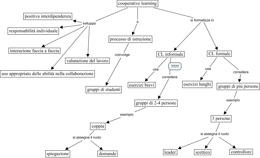 Esse mapa conceitual, produzido no IHMC CmapTools, tem a informação relacionada a: cooperative learning, 3 persone si assegna il ruolo leader, coppia si assegna il ruolo domande, cooperative learning si formalizza in CL formale, processo di istruzione coinvolge gruppi di studenti, CL formale considera gruppi di più persone, cooperative learning sviluppa positiva interdipendenza, cooperative learning sviluppa valutazione del lavoro, cooperative learning si formalizza in CL informale, CL informale usa esercizi brevi, cooperative learning è processo di istruzione, cooperative learning sviluppa uso appropriato delle abilità nella collaborazione, coppia si assegna il ruolo spiegazione, gruppi di più persone esempio 3 persone, CL informale considera gruppi di 2-4 persone, cooperative learning sviluppa responsabilità individuale, 3 persone si assegna il ruolo scettico, 3 persone si assegna il ruolo controllore, CL formale usa esercizi lunghi, gruppi di 2-4 persone esempio coppia, cooperative learning sviluppa interazione faccia a faccia