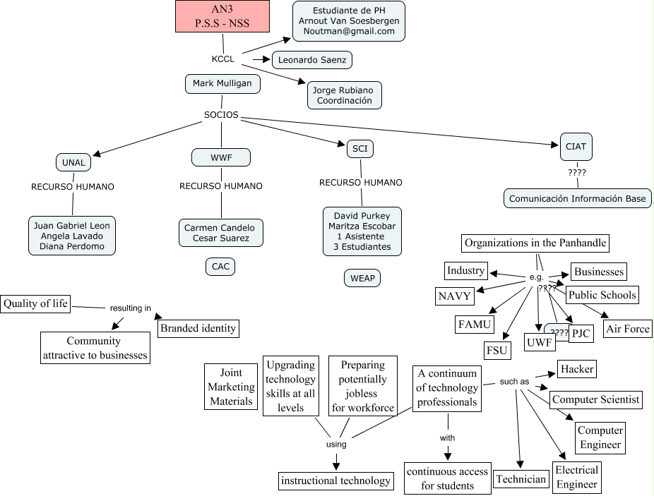 Este Cmap, tiene información relacionada con: General, Mark Mulligan SOCIOS UNAL, Mark Mulligan SOCIOS CIAT, Organizations in the Panhandle e.g. FSU, SCI RECURSO HUMANO David Purkey Maritza Escobar 1 Asistente 3 Estudiantes, CIAT ???? Comunicación Información Base, Organizations in the Panhandle e.g. UWF, AN3 P.S.S - NSS KCCL Leonardo Saenz, Organizations in the Panhandle e.g. PJC, Upgrading technology skills at all levels using instructional technology, Organizations in the Panhandle e.g. Public Schools, UNAL RECURSO HUMANO Juan Gabriel Leon Angela Lavado Diana Perdomo, A continuum of technology professionals such as Electrical Engineer, Organizations in the Panhandle e.g. FAMU, Quality of life resulting in Community attractive to businesses, AN3 P.S.S - NSS KCCL Estudiante de PH Arnout Van Soesbergen Noutman@gmail.com, Preparing potentially jobless for workforce using instructional technology, Organizations in the Panhandle ???? ????, Mark Mulligan SOCIOS WWF, Quality of life resulting in Branded identity, A continuum of technology professionals with continuous access for students