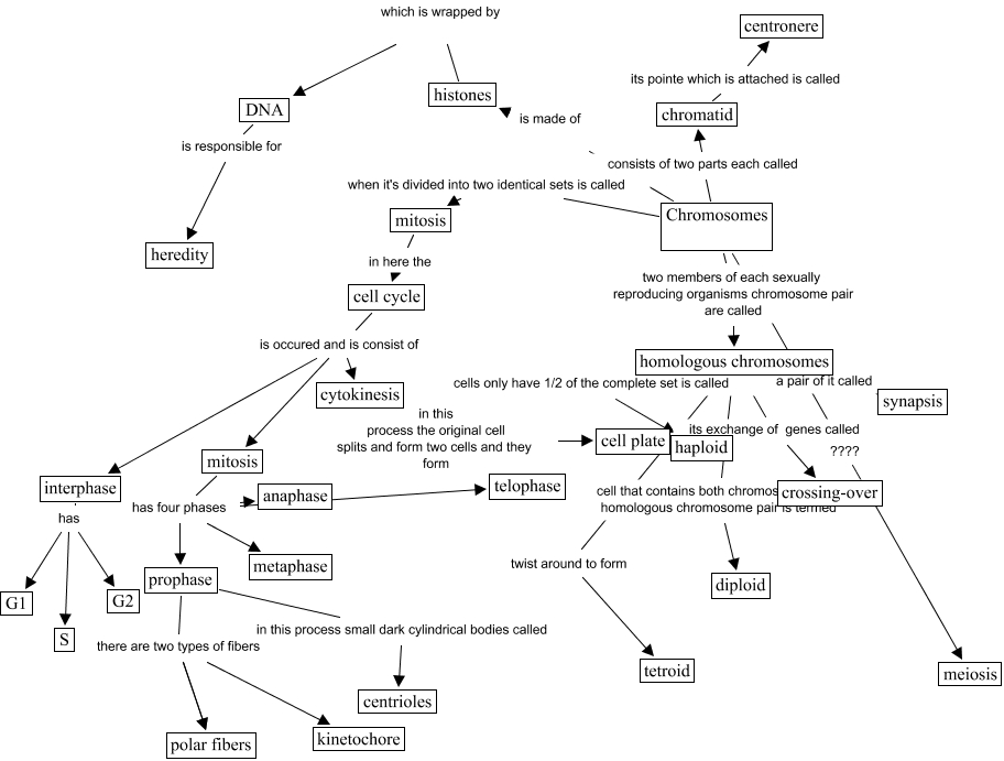 This Concept Map has information related to: chromosomes, mitosis in here the cell cycle, homologous chromosomes its exchange of genes called crossing-over, mitosis has four phases anaphase, mitosis has four phases metaphase, prophase there are two types of fibers polar fibers, prophase in this process small dark cylindrical bodies called centrioles, mitosis has four phases prophase, homologous chromosomes a pair of it called synapsis, interphase has S, homologous chromosomes cells only have 1/2 of the complete set is called haploid