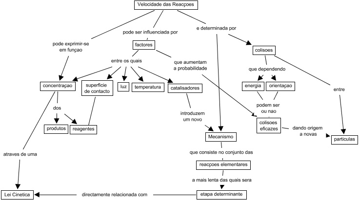 Esse mapa conceitual, produzido no IHMC CmapTools, tem a informação relacionada a: Cinetica, factores entre os quais concentraçao, factores entre os quais luz, concentraçao dos produtos, reacçoes elementares a mais lenta das quais sera etapa determinante, Mecanismo que consiste no conjunto das reacçoes elementares, Velocidade das Reacçoes pode ser influenciada por factores, factores entre os quais catalisadores, superficie de contacto ???? reagentes, colisoes eficazes dando origem a novas particulas, Velocidade das Reacçoes e determinada por colisoes, colisoes que dependendo orientaçao, colisoes que dependendo energia, orientaçao podem ser ou nao colisoes eficazes, energia podem ser ou nao colisoes eficazes, Velocidade das Reacçoes e determinada por Mecanismo, factores que aumentam a probabilidade colisoes eficazes, concentraçao atraves de uma Lei Cinetica, factores entre os quais superficie de contacto, catalisadores introduzem um novo Mecanismo, Velocidade das Reacçoes pode exprimir-se em funçao concentraçao