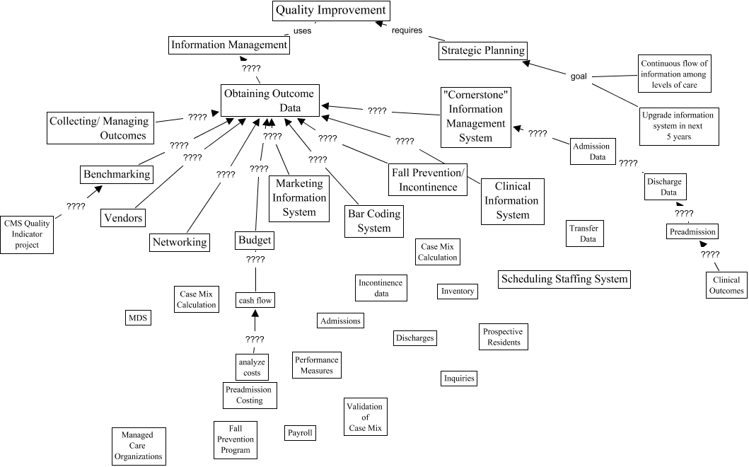 This Concept Map, created with IHMC CmapTools, has information related to: Quality Improvement, Strategic Planning requires Quality Improvement, CMS Quality Indicator project ???? Benchmarking, Discharge Data ???? Admission Data, Fall Prevention/ Incontinence ???? Obtaining Outcome Data, Clinical Outcomes ???? Preadmission, Information Management uses Quality Improvement, Upgrade information system in next 5 years goal Strategic Planning, Clinical Information System ???? Obtaining Outcome Data, Networking ???? Obtaining Outcome Data, Continuous flow of information among levels of care goal Strategic Planning, Obtaining Outcome Data ???? Information Management, Vendors ???? Obtaining Outcome Data, Preadmission ???? Discharge Data, Bar Coding System ???? Obtaining Outcome Data, cash flow ???? Budget, Benchmarking ???? Obtaining Outcome Data, Admission Data ???? "Cornerstone" Information Management System, Collecting/ Managing Outcomes ???? Obtaining Outcome Data, Budget ???? Obtaining Outcome Data, "Cornerstone" Information Management System ???? Obtaining Outcome Data