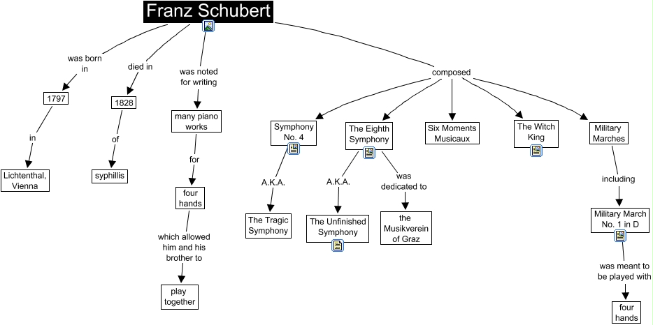This Concept Map, created with IHMC CmapTools, has information related to: schubert, Symphony No. 4 A.K.A. The Tragic Symphony, Franz Schubert was noted for writing many piano works, Military March No. 1 in D was meant to be played with four hands, Franz Schubert was born in 1797, Franz Schubert composed Symphony No. 4, Franz Schubert composed The Witch King, many piano works for four hands, Military Marches including Military March No. 1 in D, 1828 of syphillis, 1797 in Lichtenthal, Vienna, Franz Schubert died in 1828, Franz Schubert composed The Eighth Symphony, four hands which allowed him and his brother to play together, Franz Schubert composed Six Moments Musicaux, The Eighth Symphony A.K.A. The Unfinished Symphony, Franz Schubert composed Military Marches, The Eighth Symphony was dedicated to the Musikverein of Graz