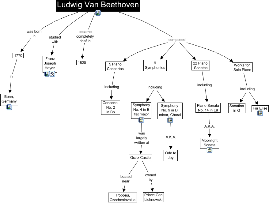 This Concept Map, created with IHMC CmapTools, has information related to: beethoven, Ludwig Van Beethoven became completely deaf in 1820, Works for Solo Piano including Sonatina in G, Ludwig Van Beethoven composed Works for Solo Piano, Symphony No. 4 in B flat major was largely written at Gratz Castle, Ludwig Van Beethoven studied with Franz Joseph Haydn, Gratz Castle located near Troppau, Czechoslovakia, Works for Solo Piano including Fur Elise, 5 Piano Concertos including Concerto No. 2 in Bb, Ludwig Van Beethoven composed 9 Symphonies, 1770 in Bonn, Germany, Gratz Castle owned by Prince Carl Lichnowski, Piano Sonata No. 14 in E# A.K.A. Moonlight Sonata, Ludwig Van Beethoven composed 22 Piano Sonatas, 22 Piano Sonatas including Piano Sonata No. 14 in E#, Ludwig Van Beethoven composed 5 Piano Concertos, 9 Symphonies including Symphony No. 4 in B flat major, Ludwig Van Beethoven was born in 1770, Symphony No. 9 in D minor, Choral A.K.A. Ode to Joy, 9 Symphonies including Symphony No. 9 in D minor, Choral