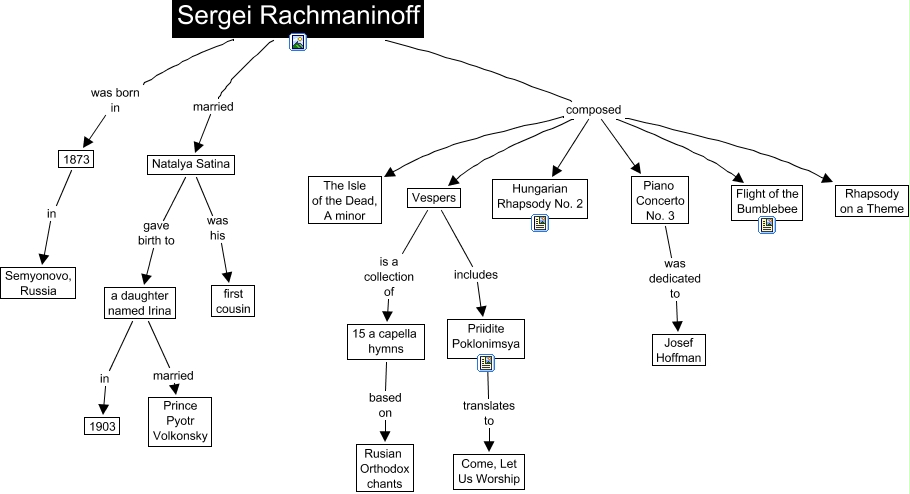 This Concept Map, created with IHMC CmapTools, has information related to: rachmaninoff, Natalya Satina was his first cousin, Sergei Rachmaninoff composed Vespers, Natalya Satina gave birth to a daughter named Irina, Piano Concerto No. 3 was dedicated to Josef Hoffman, Sergei Rachmaninoff composed Hungarian Rhapsody No. 2, Vespers includes Priidite Poklonimsya, Priidite Poklonimsya translates to Come, Let Us Worship, Sergei Rachmaninoff composed The Isle of the Dead, A minor, Vespers is a collection of 15 a capella hymns, Sergei Rachmaninoff composed Rhapsody on a Theme, Sergei Rachmaninoff composed Flight of the Bumblebee, 1873 in Semyonovo, Russia, Sergei Rachmaninoff was born in 1873, 15 a capella hymns based on Rusian Orthodox chants, Sergei Rachmaninoff married Natalya Satina, a daughter named Irina married Prince Pyotr Volkonsky, Sergei Rachmaninoff composed Piano Concerto No. 3, a daughter named Irina in 1903
