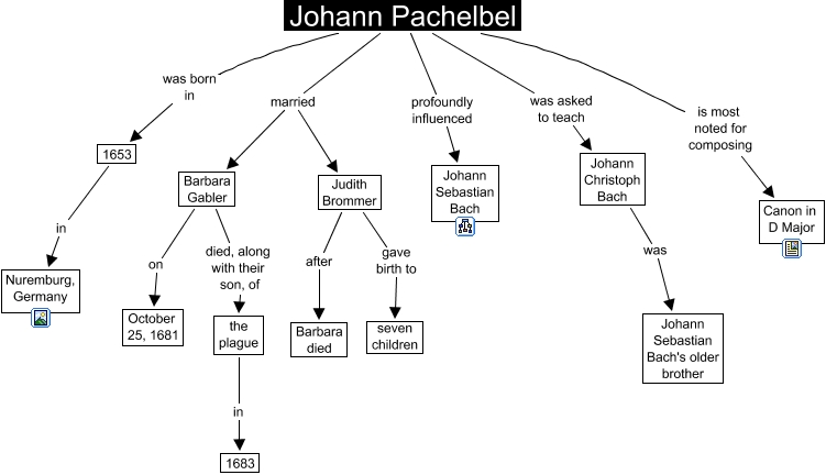 This Concept Map, created with IHMC CmapTools, has information related to: pachelbel, Johann Pachelbel was asked to teach Johann Christoph Bach, Johann Pachelbel profoundly influenced Johann Sebastian Bach, Judith Brommer after Barbara died, the plague in 1683, Johann Pachelbel was born in 1653, 1653 in Nuremburg, Germany, Barbara Gabler on October 25, 1681, Judith Brommer gave birth to seven children, Johann Pachelbel is most noted for composing Canon in D Major, Johann Pachelbel married Judith Brommer, Johann Pachelbel married Barbara Gabler, Barbara Gabler died, along with their son, of the plague, Johann Christoph Bach was Johann Sebastian Bach's older brother