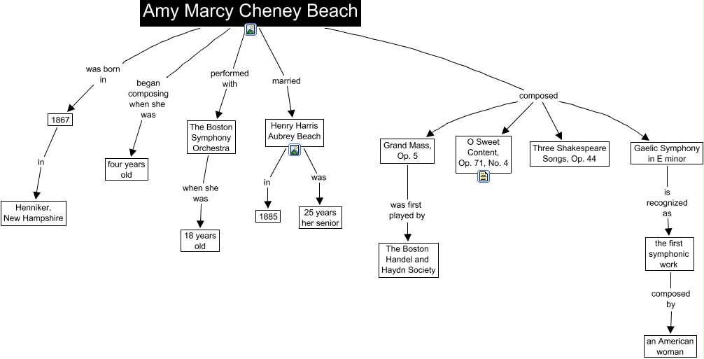 This Concept Map, created with IHMC CmapTools, has information related to: beach, The Boston Symphony Orchestra when she was 18 years old, Amy Marcy Cheney Beach began composing when she was four years old, Amy Marcy Cheney Beach composed Gaelic Symphony in E minor, Amy Marcy Cheney Beach composed Three Shakespeare Songs, Op. 44, Amy Marcy Cheney Beach was born in 1867, Amy Marcy Cheney Beach composed O Sweet Content, Op. 71, No. 4, 1867 in Henniker, New Hampshire, Grand Mass, Op. 5 was first played by The Boston Handel and Haydn Society, Amy Marcy Cheney Beach composed Grand Mass, Op. 5, the first symphonic work composed by an American woman, Amy Marcy Cheney Beach performed with The Boston Symphony Orchestra, Amy Marcy Cheney Beach married Henry Harris Aubrey Beach, Henry Harris Aubrey Beach in 1885, Henry Harris Aubrey Beach was 25 years her senior, Gaelic Symphony in E minor is recognized as the first symphonic work