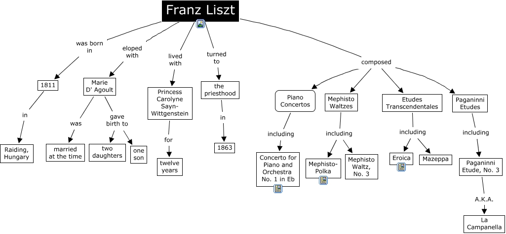 This Concept Map, created with IHMC CmapTools, has information related to: liszt, the priesthood in 1863, Piano Concertos including Concerto for Piano and Orchestra No. 1 in Eb, Franz Liszt composed Etudes Transcendentales, Franz Liszt eloped with Marie D' Agoult, Paganinni Etudes including Paganinni Etude, No. 3, Franz Liszt composed Paganinni Etudes, Paganinni Etude, No. 3 A.K.A. La Campanella, Mephisto Waltzes including Mephisto Waltz, No. 3, Franz Liszt lived with Princess Carolyne Sayn- Wittgenstein, Franz Liszt composed Mephisto Waltzes, Princess Carolyne Sayn- Wittgenstein for twelve years, Mephisto Waltzes including Mephisto- Polka, Marie D' Agoult was married at the time, Marie D' Agoult gave birth to one son, Franz Liszt composed Piano Concertos, Marie D' Agoult gave birth to two daughters, Etudes Transcendentales including Eroica, 1811 in Raiding, Hungary, Franz Liszt was born in 1811, Franz Liszt turned to the priesthood