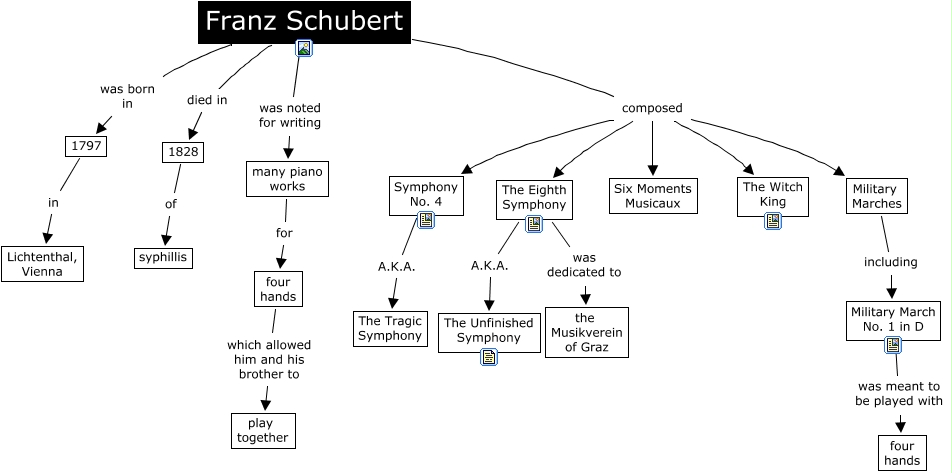 This Concept Map, created with IHMC CmapTools, has information related to: schubert, The Eighth Symphony A.K.A. The Unfinished Symphony, Franz Schubert died in 1828, 1828 of syphillis, Franz Schubert composed Six Moments Musicaux, Franz Schubert composed Military Marches, Military March No. 1 in D was meant to be played with four hands, The Eighth Symphony was dedicated to the Musikverein of Graz, Franz Schubert composed The Witch King, Military Marches including Military March No. 1 in D, 1797 in Lichtenthal, Vienna, Symphony No. 4 A.K.A. The Tragic Symphony, Franz Schubert was born in 1797, Franz Schubert was noted for writing many piano works, Franz Schubert composed Symphony No. 4, Franz Schubert composed The Eighth Symphony, many piano works for four hands, four hands which allowed him and his brother to play together