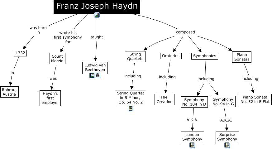 This Concept Map, created with IHMC CmapTools, has information related to: haydn, Symphonies including Symphony No. 104 in D, Franz Joseph Haydn wrote his first symphony for Count Morzin, Symphony No. 94 in G A.K.A. Surprise Symphony, Count Morzin was Haydn's first employer, String Quartets including String Quartet in B Minor, Op. 64 No. 2, Piano Sonatas including Piano Sonata No. 52 in E Flat, Oratorios including The Creation, Franz Joseph Haydn composed Symphonies, Franz Joseph Haydn composed String Quartets, Symphonies including Symphony No. 94 in G, Franz Joseph Haydn composed Piano Sonatas, Franz Joseph Haydn composed Oratorios, Symphony No. 104 in D A.K.A. London Symphony, Franz Joseph Haydn taught Ludwig van Beethoven, Franz Joseph Haydn was born in 1732, 1732 in Rohrau, Austria
