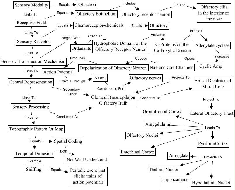 This Concept Map, created with IHMC CmapTools, has information related to: Fart Knocker, Na+ and Ca+ Channels Causes Depolarization of Olfactory Neuron, Axons Combined to Form Olfactory nerves, Topographic Pattern Or Map Equals Temporal Dimesion, Temporal Dimesion Both Not Well Understood, Sensory Modality Equals Olfaction, Sensory Modality Links To Receptive Field, Hydrophobic Domain of the Olfactory Receptor Neuron Activates G-Proteins on the Carboxylic Domain, Sensory Receptor Equals Chemoreceptor-chemicals, Chemoreceptor-chemicals Equals Olfactory, Olfactory nerves Projects To Glomeuli (neuropils)on Olfactory Bulb, Receptive Field Links To Sensory Receptor, Adenylate cyclase Increases Cyclic Amp, Glomeuli (neuropils)on Olfactory Bulb Connects To Apical Dendrites of Mitral Cells, Sensory Receptor Links To Sensory Transduction Mechanism, Lateral Olfactory Tract Leads To Amygdula, Receptive Field Equals Olfactory Epithelium, Spatial Coding Both Not Well Understood, Sensory Transduction Mechanism Begins With Ordanants, Sensory Processing Links To Topographic Pattern Or Map, PyriformCortex Projects To Thalmic Nuclei