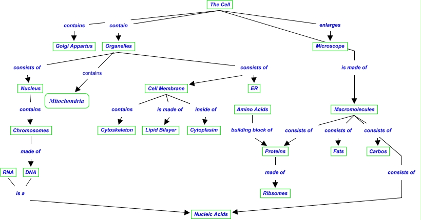This Concept Map, created with IHMC CmapTools, has information related to: Cells, The Cell contains Golgi Appartus, Amino Acids building block of Proteins, DNA is a Nucleic Acids, The Cell is made of Macromolecules, Organelles consists of Cell Membrane, Proteins made of Ribsomes, RNA is a Nucleic Acids, The Cell enlarges Microscope, Nucleus contains Chromosomes, Cell Membrane is made of Lipid Bilayer, Macromolecules consists of Fats, Cell Membrane inside of Cytoplasim, Chromosomes made of DNA, Organelles contains Mitochondria, Macromolecules consists of Nucleic Acids, The Cell contain Organelles, Organelles consists of ER, Cell Membrane contains Cytoskeleton, Organelles consists of Nucleus, Macromolecules consists of Carbos