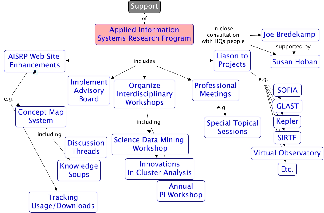 This Concept Map, created with IHMC CmapTools, has information related to: AISRP_support, Liason to Projects e.g. Kepler, AISRP Web Site Enhancements e.g. Tracking Usage/Downloads, Applied Information Systems Research Program includes Organize Interdisciplinary Workshops, Liason to Projects e.g. GLAST, Concept Map System including Discussion Threads, Applied Information Systems Research Program in close consultation with HQs people Joe Bredekamp, Liason to Projects e.g. SIRTF, Applied Information Systems Research Program in close consultation with HQs people Susan Hoban, Liason to Projects e.g. SOFIA, Applied Information Systems Research Program includes Professional Meetings, Support of Applied Information Systems Research Program, Liason to Projects e.g. Etc., Joe Bredekamp supported by Susan Hoban, Applied Information Systems Research Program includes Implement Advisory Board, Organize Interdisciplinary Workshops including Innovations In Cluster Analysis, Professional Meetings e.g. Special Topical Sessions, AISRP Web Site Enhancements e.g. Concept Map System, Concept Map System including Knowledge Soups, Applied Information Systems Research Program includes AISRP Web Site Enhancements, Liason to Projects e.g. Virtual Observatory