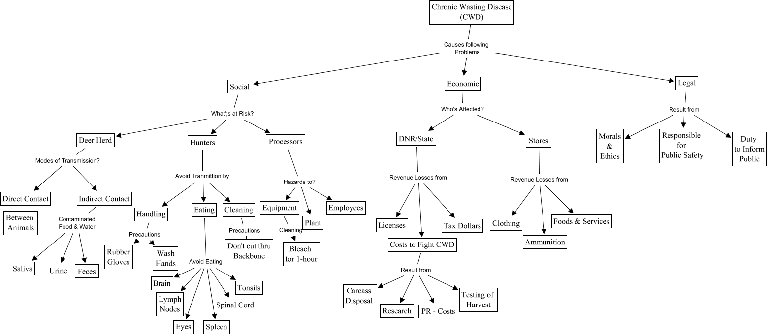 This Concept Map, created with IHMC CmapTools, has information related to: CWD, Legal Result from Duty to Inform Public, Chronic Wasting Disease (CWD) Causes following Problems Legal, Eating Avoid Eating Spinal Cord, Stores Revenue Losses from Ammunition, Processors Hazards to? Plant, Chronic Wasting Disease (CWD) Causes following Problems Social, Eating Avoid Eating Spleen, Eating Avoid Eating Tonsils, DNR/State Revenue Losses from Licenses, Eating Avoid Eating Lymph Nodes, Processors Hazards to? Equipment, Eating Avoid Eating Eyes, Social What';s at Risk? Processors, Cleaning Precautions Don't cut thru Backbone, Costs to Fight CWD Result from PR - Costs, Stores Revenue Losses from Foods & Services, Costs to Fight CWD Result from Carcass Disposal, DNR/State Revenue Losses from Tax Dollars, Handling Precautions Rubber Gloves, Eating Avoid Eating Brain