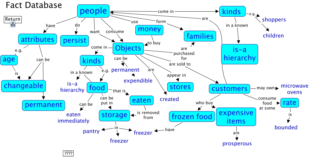 This Concept Map, created with IHMC CmapTools, has information related to: Fact Database, customers consume food at some rate, Objects come in kinds, customers who buy expensive items, age is changeable, storage in pantry, attributes can be changeable, Objects are created, food that is eaten, customers who buy frozen food, people want Objects, kinds in a known is-a hierarchy, kinds e.g. children, food can be put in storage, Objects can be permanent, Objects are sold to customers, storage in freezer, people have attributes, storage in freezer, customers may own microwave ovens, people form families