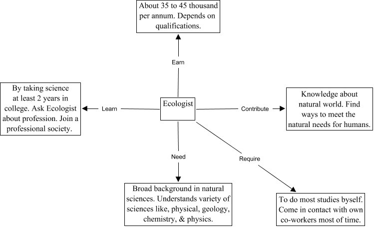 This Concept Map, created with IHMC CmapTools, has information related to: CareersMap, Ecologist Learn By taking science at least 2 years in college. Ask Ecologist about profession. Join a professional society., Ecologist Earn About 35 to 45 thousand per annum. Depends on qualifications., Ecologist Require To do most studies byself. Come in contact with own co-workers most of time., Ecologist Contribute Knowledge about natural world. Find ways to meet the natural needs for humans., Ecologist Need Broad background in natural sciences. Understands variety of sciences like, physical, geology, chemistry, & physics.