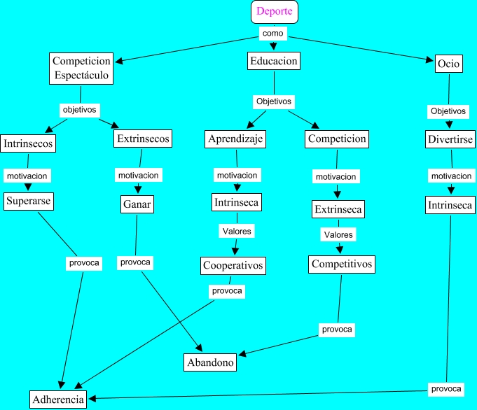 Este Cmap, tiene información relacionada con: Manifestaciones, Superarse provoca Adherencia, Ganar provoca Abandono, Extrinseca Valores Competitivos, Extrinsecos motivacion Ganar, Intrinsecos motivacion Superarse, Deporte como Educacion, Educacion Objetivos Competicion, Competitivos provoca Abandono, Divertirse motivacion Intrinseca, Ocio Objetivos Divertirse, Intrinseca Valores Cooperativos, Cooperativos provoca Adherencia, Deporte como Ocio, Deporte como Competicion Espectáculo, Aprendizaje motivacion Intrinseca, Competicion Espectáculo objetivos Extrinsecos, Educacion Objetivos Aprendizaje, Competicion Espectáculo objetivos Intrinsecos, Competicion motivacion Extrinseca, Intrinseca provoca Adherencia