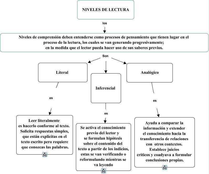 Este Cmap, tiene información relacionada con: MEMOINV(Gonzalez_2001), NIVELES DE LECTURA los Niveles de comprensión deben entenderse como procesos de pensamiento que tienen lugar en el proceso de la lectura, los cuales se van generando progresivamente; en la medida que el lector pueda hacer uso de sus saberes previos., Niveles de comprensión deben entenderse como procesos de pensamiento que tienen lugar en el proceso de la lectura, los cuales se van generando progresivamente; en la medida que el lector pueda hacer uso de sus saberes previos. Son Analógico, Niveles de comprensión deben entenderse como procesos de pensamiento que tienen lugar en el proceso de la lectura, los cuales se van generando progresivamente; en la medida que el lector pueda hacer uso de sus saberes previos. Son Literal, Inferencial es Se activa el conocimiento previo del lector y se formulan hipótesis sobre el contenido del texto a partir de los indicios, estas se van verificando o reformulando mientras se va leyendo, Niveles de comprensión deben entenderse como procesos de pensamiento que tienen lugar en el proceso de la lectura, los cuales se van generando progresivamente; en la medida que el lector pueda hacer uso de sus saberes previos. Son Inferencial, Literal es Leer literalmente es hacerlo conforme al texto. Solicita respuestas simples, que están explicitas en el texto escrito pero requiere que conozcas las palabras., Analógico es Ayuda a comparar la información y extender el conocimiento hacia la transferencia de relaciones con otros contextos. Establece juicios críticos y coadyuva a formular conclusiones propias.