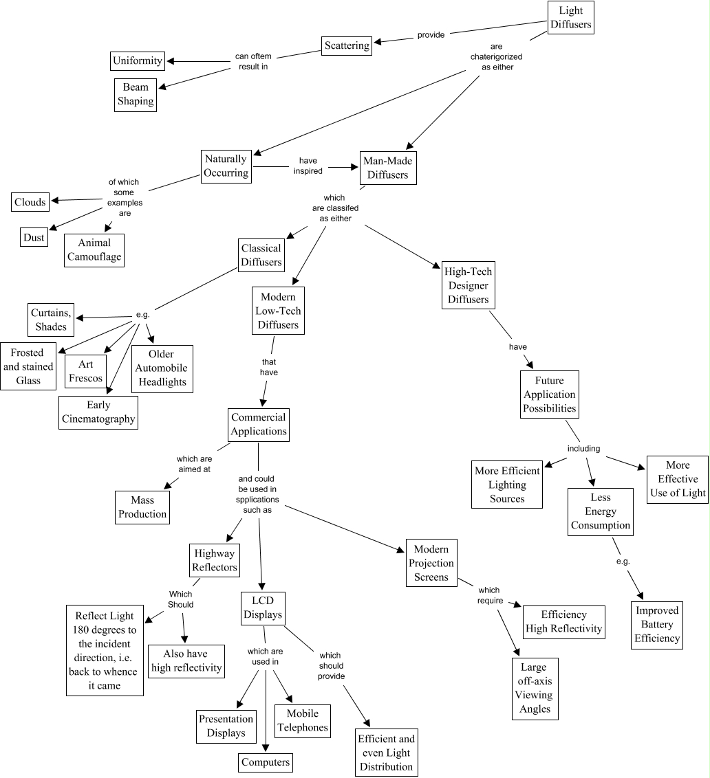 This Concept Map, created with IHMC CmapTools, has information related to: LightDiffusion2, Commercial Applications which are aimed at Mass Production, Naturally Occurring of which some examples are Clouds, Modern Low-Tech Diffusers that have Commercial Applications, Light Diffusers provide Scattering, LCD Displays which are used in Presentation Displays, Naturally Occurring have inspired Man-Made Diffusers, Less Energy Consumption e.g. Improved Battery Efficiency, LCD Displays which should provide Efficient and even Light Distribution, Future Application Possibilities including Less Energy Consumption, Naturally Occurring of which some examples are Animal Camouflage, Light Diffusers are chaterigorized as either Naturally Occurring, Future Application Possibilities including More Effective Use of Light, Naturally Occurring of which some examples are Dust, Scattering can oftem result in Beam Shaping, Man-Made Diffusers which are classifed as either High-Tech Designer Diffusers, Light Diffusers are chaterigorized as either Man-Made Diffusers, Classical Diffusers e.g. Older Automobile Headlights, Classical Diffusers e.g. Frosted and stained Glass, Classical Diffusers e.g. Curtains, Shades, Classical Diffusers e.g. Art Frescos