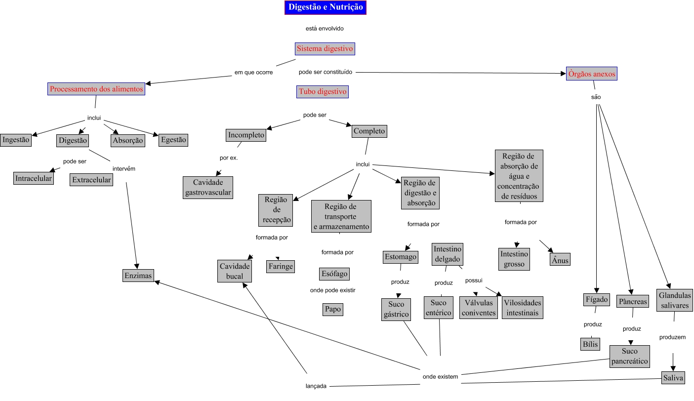 Esse mapa conceitual, produzido no IHMC CmapTools, tem a informação relacionada a: Digestao e nutriçao, Região de recepção formada por Cavidade bucal, Região de digestão e absorção formada por Estomago, Região de absorção de água e concentração de resíduos formada por Ânus, Região de absorção de água e concentração de resíduos formada por Intestino grosso, Sistema digestivo em que ocorre Processamento dos alimentos, Completo inclui Região de transporte e armazenamento, Òrgãos anexos são Glandulas salivares, Processamento dos alimentos inclui Egestão, Tubo digestivo pode ser Incompleto, Digestão intervêm Enzimas, Suco entérico onde existem Enzimas, Intestino delgado produz Suco entérico, Glandulas salivares produzem Saliva, Região de digestão e absorção formada por Intestino delgado, Intestino delgado possui Vilosidades intestinais, Sistema digestivo pode ser constituído Òrgãos anexos, Sistema digestivo pode ser constituído Tubo digestivo, Digestão pode ser Extracelular, Região de recepção formada por Faringe, Suco pancreático onde existem Enzimas