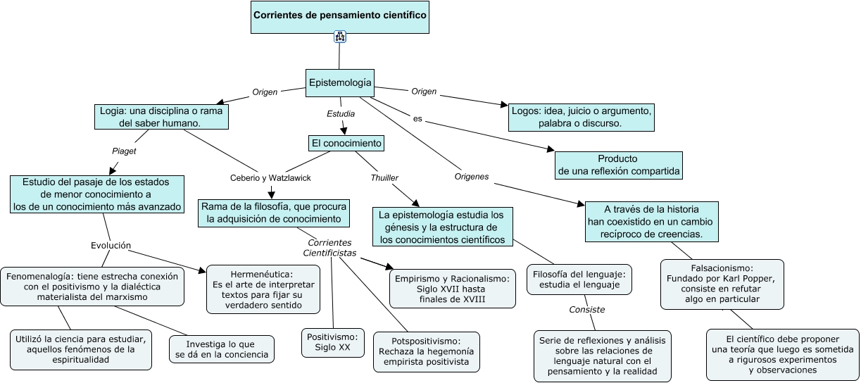 Este Cmap, tiene información relacionada con: Concept Maps, Rama de la filosofía, que procura la adquisición de conocimiento Corrientes Cientificistas Empirismo y Racionalismo: Siglo XVII hasta finales de XVIII, Rama de la filosofía, que procura la adquisición de conocimiento Corrientes Cientificistas Positivismo: Siglo XX, El conocimiento Ceberio y Watzlawick Rama de la filosofía, que procura la adquisición de conocimiento, Estudio del pasaje de los estados de menor conocimiento a los de un conocimiento más avanzado Evolución Hermenéutica: Es el arte de interpretar textos para fijar su verdadero sentido, Fenomenalogía: tiene estrecha conexión con el positivismo y la dialéctica materialista del marxismo ???? Utilizó la ciencia para estudiar, aquellos fenómenos de la espiritualidad, Epistemología Origenes A través de la historia han coexistido en un cambio recíproco de creencias., Corrientes de pensamiento científico ???? ????, Epistemología Estudia El conocimiento, Epistemología Origen Logos: idea, juicio o argumento, palabra o discurso., Rama de la filosofía, que procura la adquisición de conocimiento Corrientes Cientificistas Empirismo y Racionalismo: Siglo XVII hasta finales de XVIII, A través de la historia han coexistido en un cambio recíproco de creencias. ???? Falsacionismo: Fundado por Karl Popper, consiste en refutar algo en particular, Rama de la filosofía, que procura la adquisición de conocimiento Corrientes Cientificistas Potspositivismo: Rechaza la hegemonía empirista positivista, Fenomenalogía: tiene estrecha conexión con el positivismo y la dialéctica materialista del marxismo Investiga Investiga lo que se dá en la conciencia, Logia: una disciplina o rama del saber humano. Ceberio y Watzlawick Rama de la filosofía, que procura la adquisición de conocimiento, Epistemología es Producto de una reflexión compartida, Epistemología Origen Logia: una disciplina o rama del saber humano., Filosofía del lenguaje: estudia el lenguaje Consiste Serie de reflexiones y análisis sobre las relaciones de lenguaje natural con el pensamiento y la realidad, Estudio del pasaje de los estados de menor conocimiento a los de un conocimiento más avanzado Evolución Fenomenalogía: tiene estrecha conexión con el positivismo y la dialéctica materialista del marxismo, El conocimiento Thuiller La epistemología estudia los génesis y la estructura de los conocimientos científicos, Logia: una disciplina o rama del saber humano. Piaget Estudio del pasaje de los estados de menor conocimiento a los de un conocimiento más avanzado