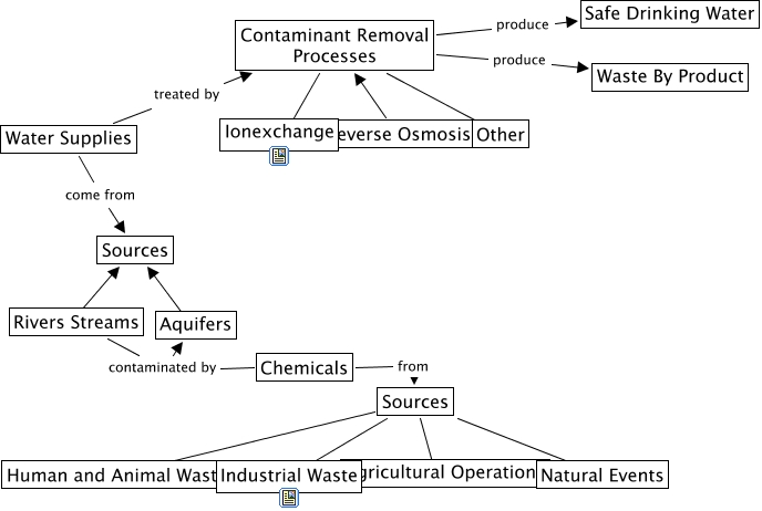 This Concept Map, created with IHMC CmapTools, has information related to: Drinking Water, Water Supplies come from Sources, Sources ???? Human and Animal Waste, Contaminant Removal Processes produce Waste By Product, Aquifers Sources, Contaminant Removal Processes produce Safe Drinking Water, Rivers Streams ???? Sources, Contaminant Removal Processes ???? Ionexchange, Sources ???? Agricultural Operations, Water Supplies treated by Contaminant Removal Processes, Reverse Osmosis ???? Contaminant Removal Processes, Sources ???? Natural Events, Contaminant Removal Processes ???? Other, Chemicals from Sources, Chemicals contaminated by Aquifers, Rivers Streams contaminated by Aquifers, Sources ???? Industrial Waste