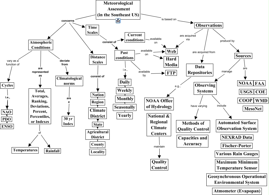 This Concept Map, created with IHMC CmapTools, has information related to: Meteorological Assessment, Total, Averages, Ranking, Deviations, Percent, Percentiles, or Indexes of Temperatures, Past conditions i.e., Seasonally, Meteorological Assessment (in the Southeast US) concerns Time Scales, Distance Scales consist of Agricultural District, Cycles i.e., NAO, Distance Scales consist of Locality, Climatological norms are a 30 yr Index, Time Scales consist of Past conditions, Atmospheric Conditions are represented as Total, Averages, Ranking, Deviations, Percent, Percentiles, or Indexes, Observations are acquired via Web, Past conditions available on Web, Distance Scales consist of Region, Total, Averages, Ranking, Deviations, Percent, Percentiles, or Indexes of Rainfall, Past conditions i.e., Monthly, Past conditions available on Hard Media, Distance Scales consist of State, Past conditions i.e., Yearly, Data Repositories e.g., NOAA Office of Hydrology, Observations producd by Sources, National & Regional Climate Centers maintain Quality Control
