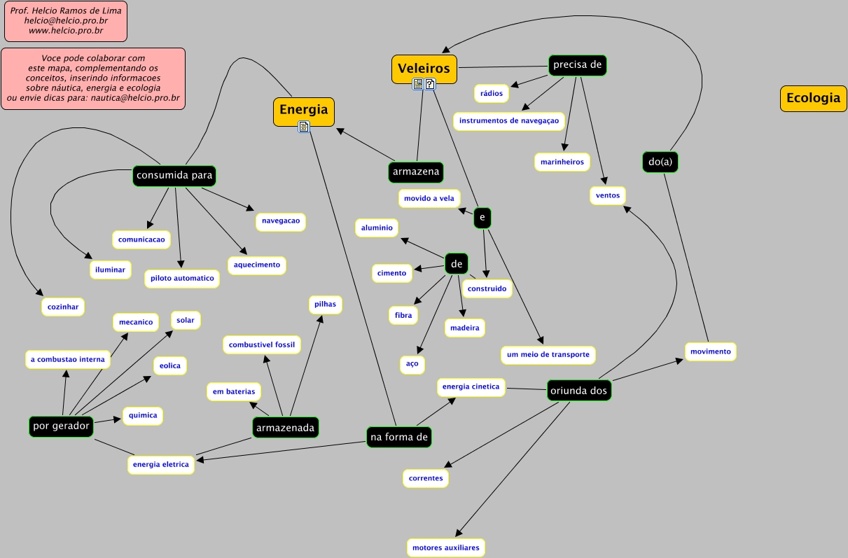 This Concept Map, created with IHMC CmapTools, has information related to: Energia_Ecologia_Veleiros, Energia na forma de energia cinetica, Veleiros e um meio de transporte, Energia consumida para comunicacao, energia eletrica por gerador quimica, construido de aluminio, Veleiros e movido a vela, Energia consumida para cozinhar, energia eletrica por gerador a combustao interna, energia eletrica por gerador eolica, energia cinetica oriunda dos ventos, energia eletrica por gerador mecanico, Veleiros precisa de ventos, Energia consumida para navegacao, Veleiros armazena Energia, energia cinetica oriunda dos movimento, Veleiros precisa de rádios, Energia consumida para aquecimento, energia eletrica armazenada em baterias, construido de fibra, Veleiros precisa de marinheiros