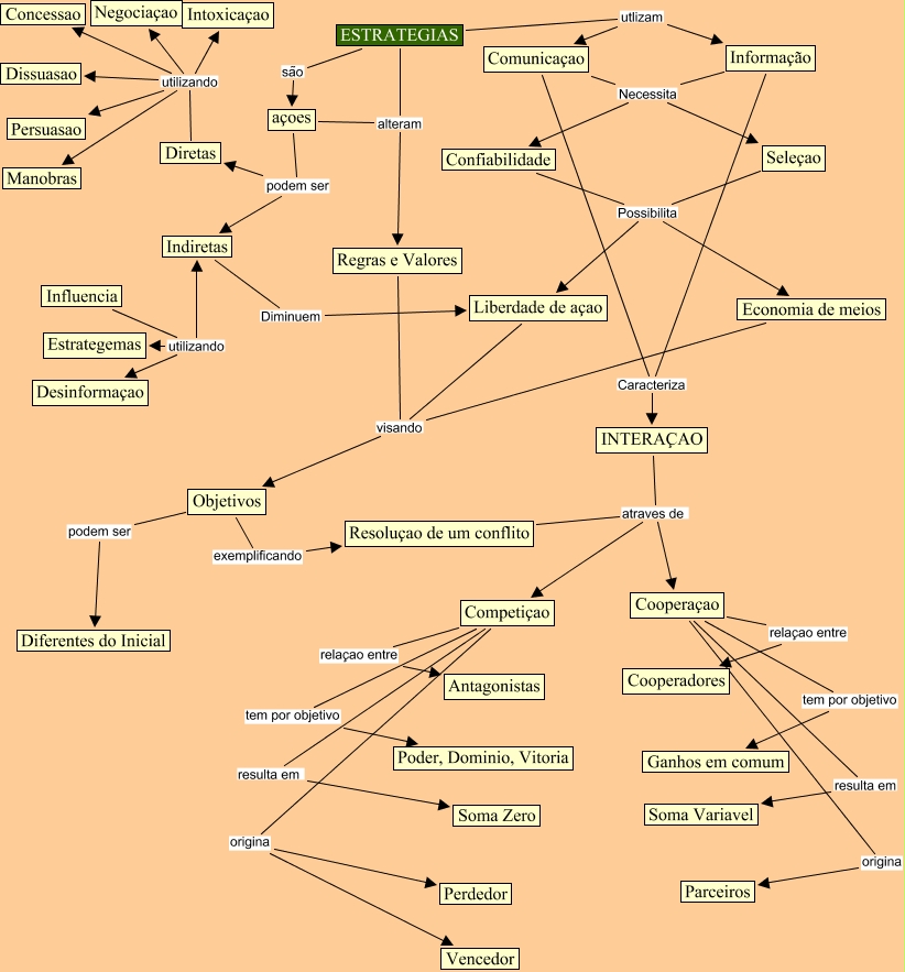 This Concept Map, created with IHMC CmapTools, has information related to: Louise_Estrategias_2, Economia de meios visando Objetivos, açoes podem ser Diretas, Influencia utilizando Estrategemas, Competiçao origina Vencedor, Influencia utilizando Indiretas, Seleçao Possibilita Economia de meios, Confiabilidade Possibilita Economia de meios, Confiabilidade Possibilita Liberdade de açao, Comunicaçao Necessita Confiabilidade, Objetivos podem ser Diferentes do Inicial, Competiçao resulta em Soma Zero, ESTRATEGIAS utlizam Informação, Cooperaçao tem por objetivo Ganhos em comum, Competiçao origina Perdedor, Seleçao Possibilita Liberdade de açao, Diretas utilizando Intoxicaçao, Regras e Valores visando Objetivos, Resoluçao de um conflito atraves de Cooperaçao, açoes alteram Regras e Valores, Influencia utilizando Desinformaçao