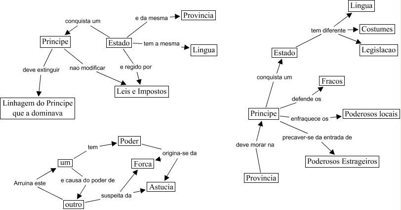 Esse mapa conceitual, produzido no IHMC CmapTools, tem a informação relacionada a: O_Principe, Estado tem diferente Costumes, Principe defende os Fracos, um tem Poder, Estado tem a mesma Lingua, Estado tem diferente Lingua, Estado e regido por Leis e Impostos, Estado conquista um Principe, outro suspeita da Astucia, um e causa do poder de outro, Estado e da mesma Provincia, Provincia deve morar na Principe, Principe conquista um Estado, Poder origina-se da Forca, Principe nao modificar Leis e Impostos, Principe enfraquece os Poderosos locais, Poder origina-se da Astucia, Estado tem diferente Legislacao, outro suspeita da Forca, Principe deve extinguir Linhagem do Principe que a dominava, outro Arruina este um