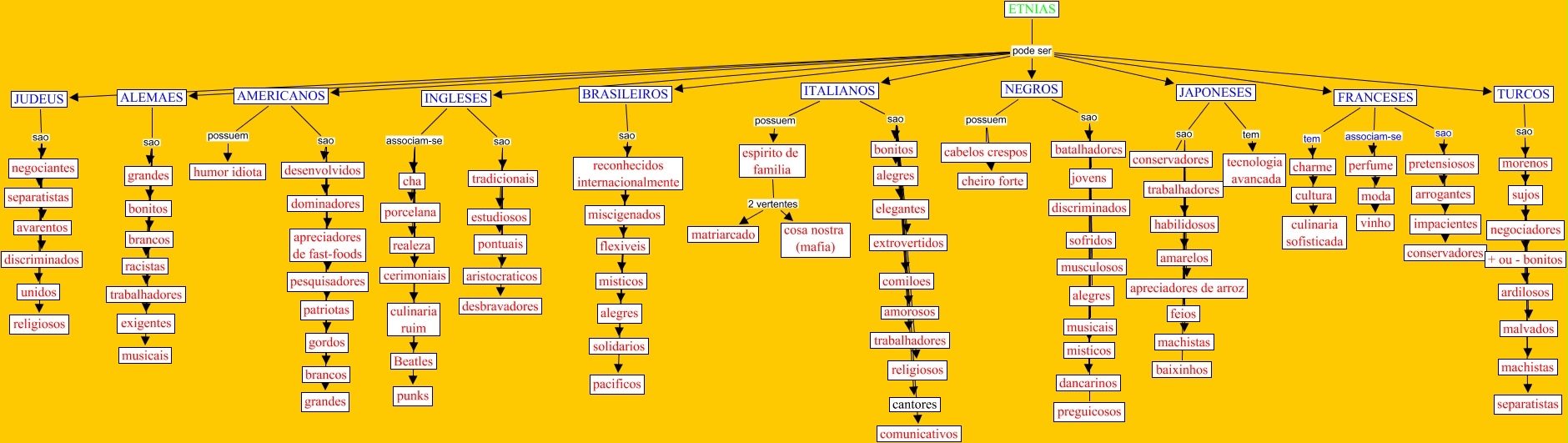 Este Cmap, tiene información relacionada con: Etnias, espirito de familia 2 vertentes cosa nostra (mafia), INGLESES associam-se cerimoniais, discriminados sao dancarinos, conservadores sao apreciadores de arroz, musculosos sao misticos, INGLESES sao estudiosos, ITALIANOS sao trabalhadores, FRANCESES tem charme, NEGROS sao batalhadores, ETNIAS pode ser JAPONESES, FRANCESES tem cultura, ITALIANOS sao elegantes, ITALIANOS sao amorosos, TURCOS sao malvados, feios sao amarelos, JUDEUS sao separatistas, AMERICANOS sao brancos, musculosos sao batalhadores, ITALIANOS sao comiloes, AMERICANOS possuem humor idiota