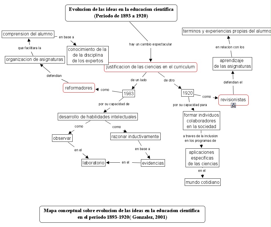 This Concept Map, created with IHMC CmapTools, has information related to: 18931920, formar individuos colaboradores en la sociedad a traves de la inclusion en los programas de aplicaciones especificas de las ciencias, formar individuos colaboradores en la sociedad a traves de la inclusion en los programas de aplicaciones especificas de las ciencias, aplicaciones especificas de las ciencias en el mundo cotidiano, aprendizaje de las asignaturas en relacion con los terminos y experiencias propias del alumno, razonar inductivamente en base a evidencias, 1920 como revisionistas, justificacion de las ciencias en el curriculum de un lado 1983, observar en el laboratorio, reformadores defendian organizacion de asignaturas, evidencias en el laboratorio, Evolucion de las ideas en la educacion cientifica (Periodo de 1893 a 1920) hay un cambio espectacular justificacion de las ciencias en el curriculum, desarrollo de habilidades intelectuales como razonar inductivamente, justificacion de las ciencias en el curriculum de otro 1920, formar individuos colaboradores en la sociedad a traves de la inclusion en los programas de aplicaciones especificas de las ciencias, organizacion de asignaturas que facilitara la comprension del alumno, 1920 por su capacidad para formar individuos colaboradores en la sociedad, 1983 como reformadores, desarrollo de habilidades intelectuales como observar, 1983 por su capacidad de desarrollo de habilidades intelectuales, revisionistas defendian el aprendizaje de las asignaturas